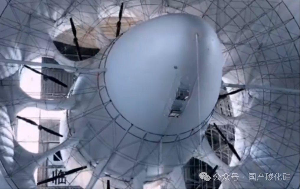 升空与悬浮:系统由轻质气囊充满安全氦气提供主要浮力,外形类似巨型飞艇,长 60 米、宽 40 米、高 40 米,总重约 50 吨。升空时地面牵引逐步升至 1500 米高空,该高度风速通常是地面的 3 倍(约 15m/s),风能密度高、稳定。三根高强度碳纤维系缆(抗拉 3000MPa)与气囊压力、环翼角度协同控制,实现 12 级强风下稳定悬浮与 ±0.5° 风向对准。