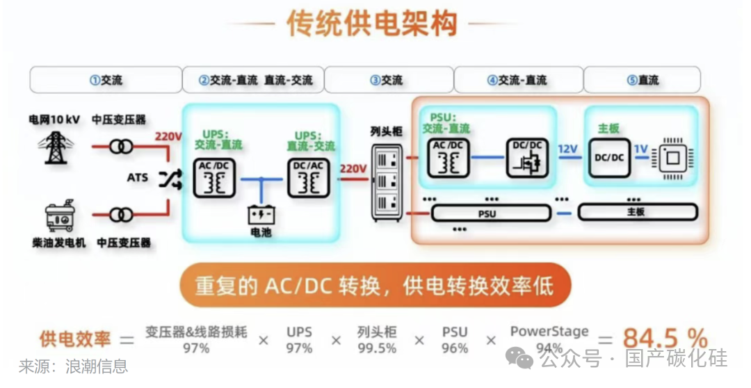传统架构基准:采用 380V 交流供电,从电网到芯片需经历 5 次交直流转换,整体能效利用率仅 84.5%,供电损耗约 15.5%。
