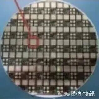 示意图看得更加清晰,制造流程即将结束时,会沿着划片道(图中红色的横纵线条),将晶圆切分为诸多方形管芯,即为图中的橙色方形区域,