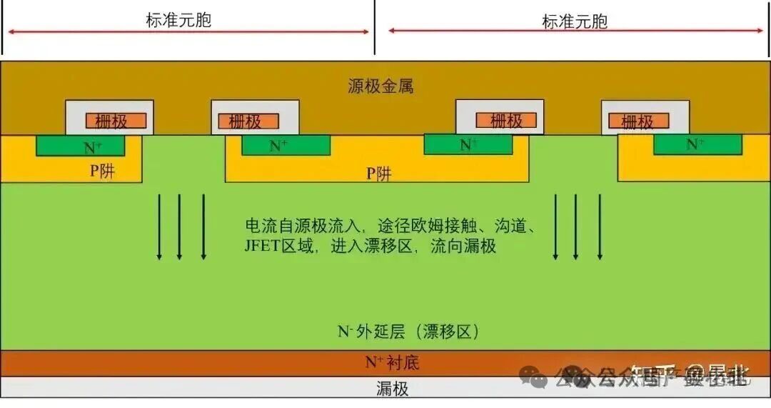顶部并联的元胞+ 底部串联的漂移区和衬底,功率MOSFET的有源区,并非单一的晶体管,而是由成千上万个完全相同的、微小的晶体管单元紧密排列,再通过并联连接而成。