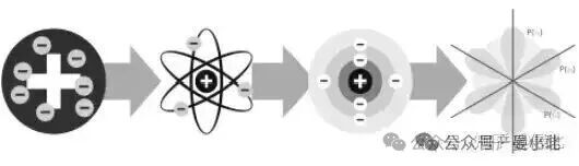 如上图,从左到右,依次为“葡萄干布丁模型”、“原子行星模型”、“玻尔模型”以及后来的“电子云模型”。